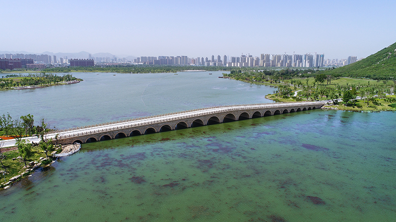 崇正橋,位于華山南側(cè),連接華山及華山湖南岸,總長(zhǎng)約 96 米,為三孔拱橋,是華山濕地公園的重要門戶。煙雨橋,位于華山東側(cè),橋梁全長(zhǎng)約 200米,為 21 孔拱橋,狀若長(zhǎng)虹臥波,是華山濕地公園的優(yōu)美名片。