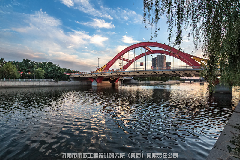 匯集了多種橋型,與小清河的自然環(huán)境、人文景觀有機(jī)地結(jié)合在一起,包括變截面連續(xù)梁橋、斜腿鋼構(gòu)橋、預(yù)應(yīng)力連續(xù)組合梁拱結(jié)構(gòu)、斜拉橋、中承式系桿拱橋等。在考慮結(jié)構(gòu)整體和交通功能的同時(shí),把握城市橋梁的景觀特性,做到工程和景觀的和諧統(tǒng)一。成為城市河道橋梁大量、有機(jī)結(jié)合的典范。